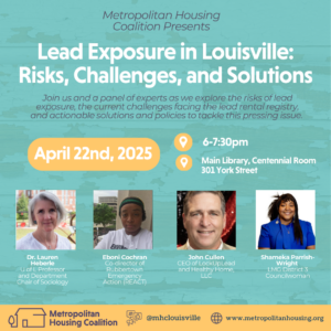 Join MHC for our Affordable Housing Month event: Lead Exposure in Louisville: Risks, Challenges, and Solutions. This lead exposure panel will be held on Tuesday, April 22 at 6pm, at the Main Library (Lower Level, Centennial Room). Hear from key community leaders as we discuss risks, challenges, and solutions for lead exposure in Louisville. Don’t miss this important conversation! RSVP at https://forms.gle/rRcnCuF2WuwRz16E9