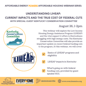 Join us on August 26th at 1 PM for “Understanding LIHEAP: Current Impacts and the True Cost of Federal Cuts,” a webinar focused on the rising energy burdens faced by low-income households and the vital role LIHEAP plays in providing relief. We’ll examine the potential impacts of federal funding cuts and hear a legislative update from Lane Boldman of the Kentucky Conservation Committee (KCC) on LIHEAP’s current status and future at the policy level. This is a crucial conversation for anyone concerned with energy equity and federal support programs.